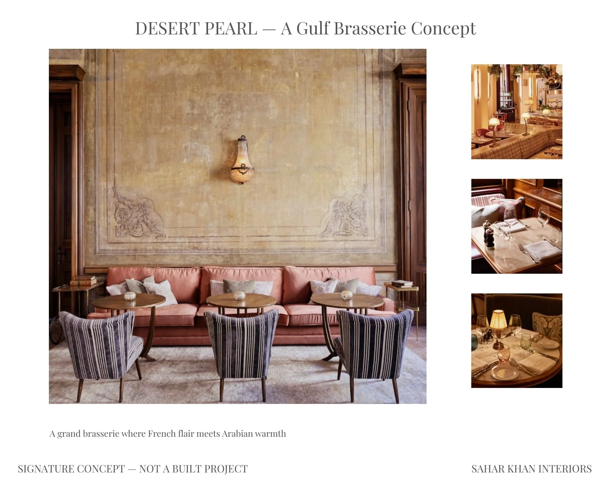 A personal hospitality concept exploring the meeting point between French brasserie elegance and Arabian warmth. Designed as a grand yet intimate space layered with cherry wood, veined marble, soft blush tones, and gilded details. This concept reflects the type of hospitality projects I hope to bring to life in the Gulf region. While conceived as a hospitality concept, the studio’s approach to materiality, palette, and spatial flow directly informs our residential work — particularly for clients seeking layered, timeless interiors with a global sensibility.