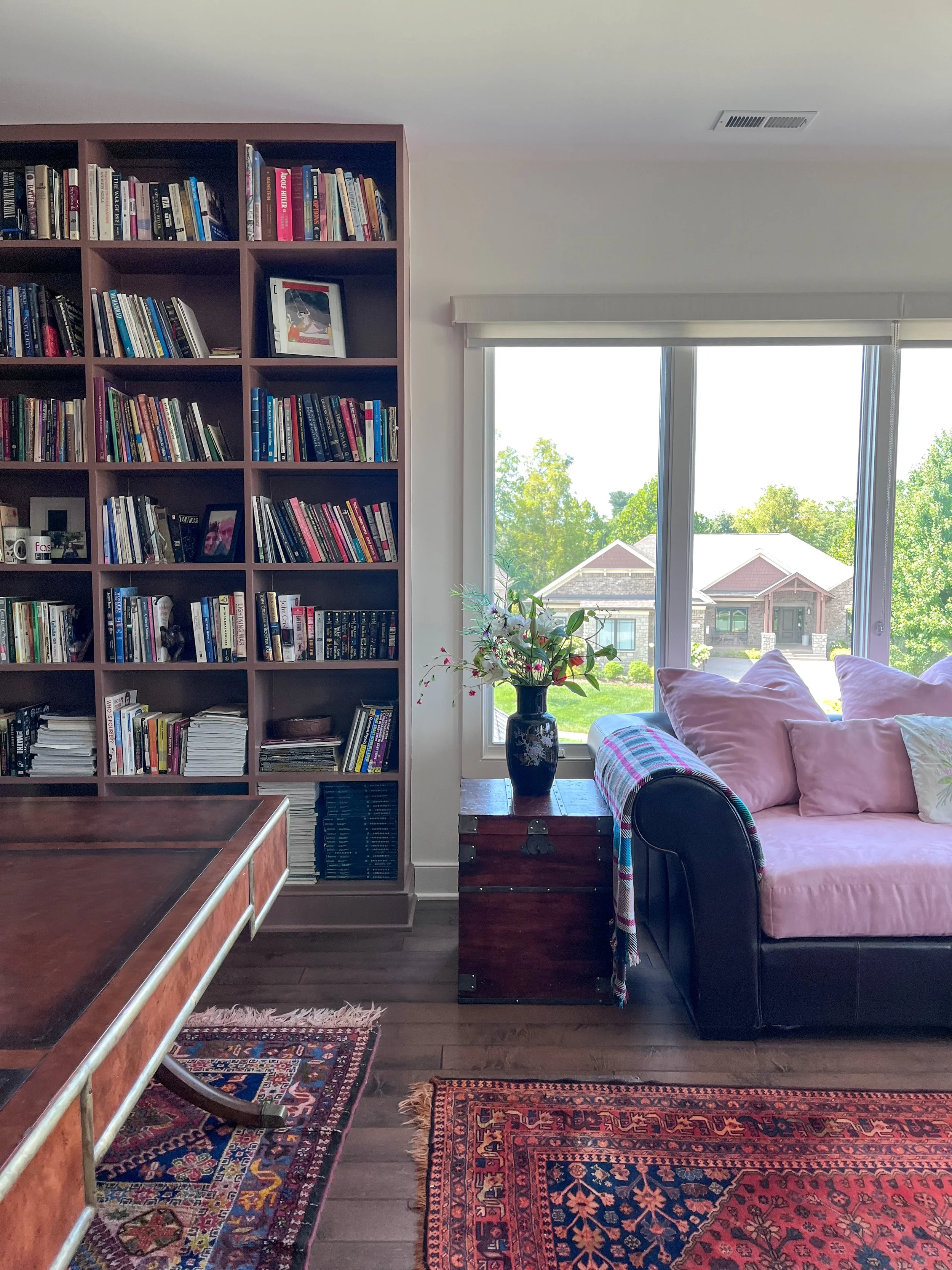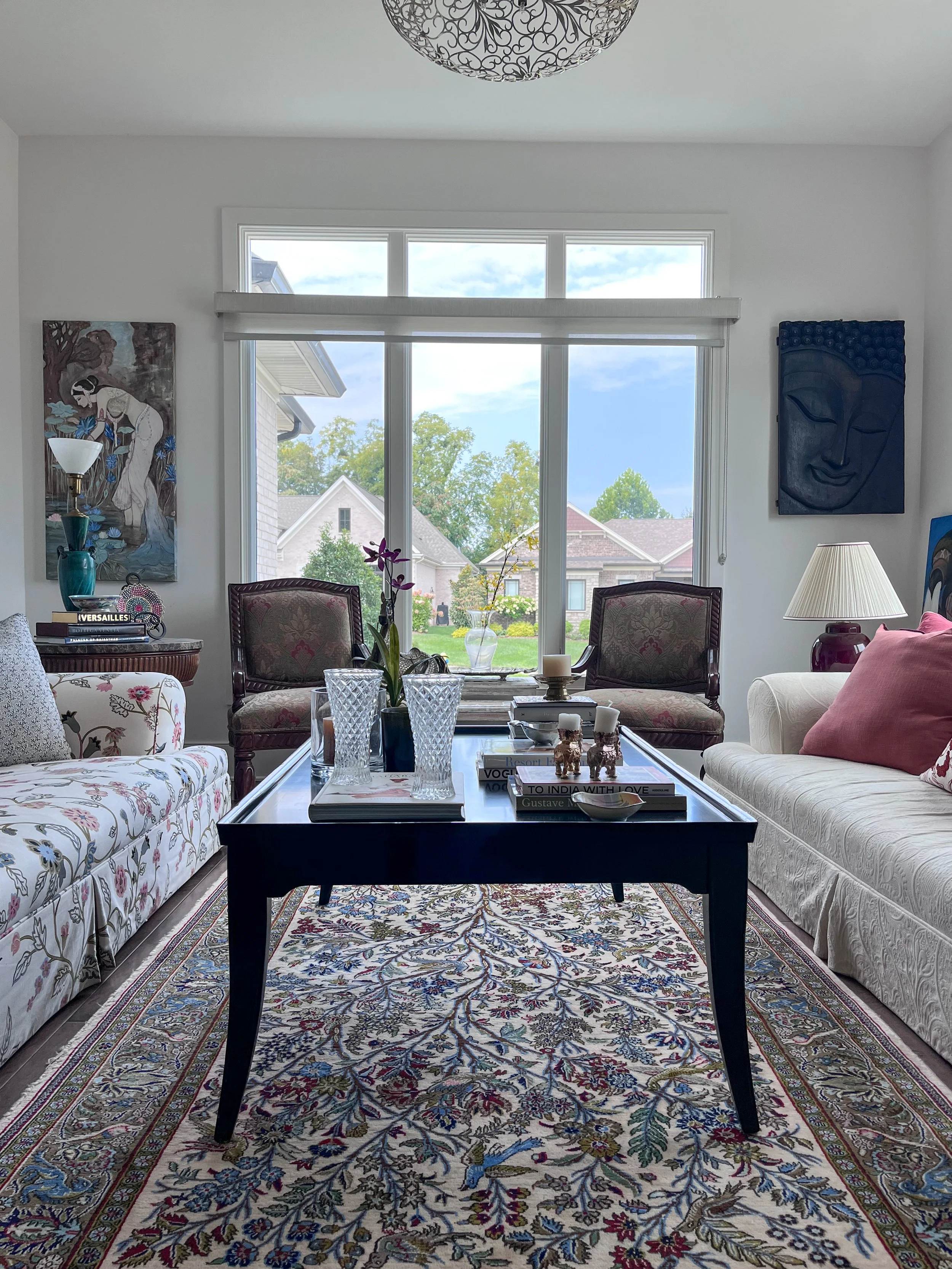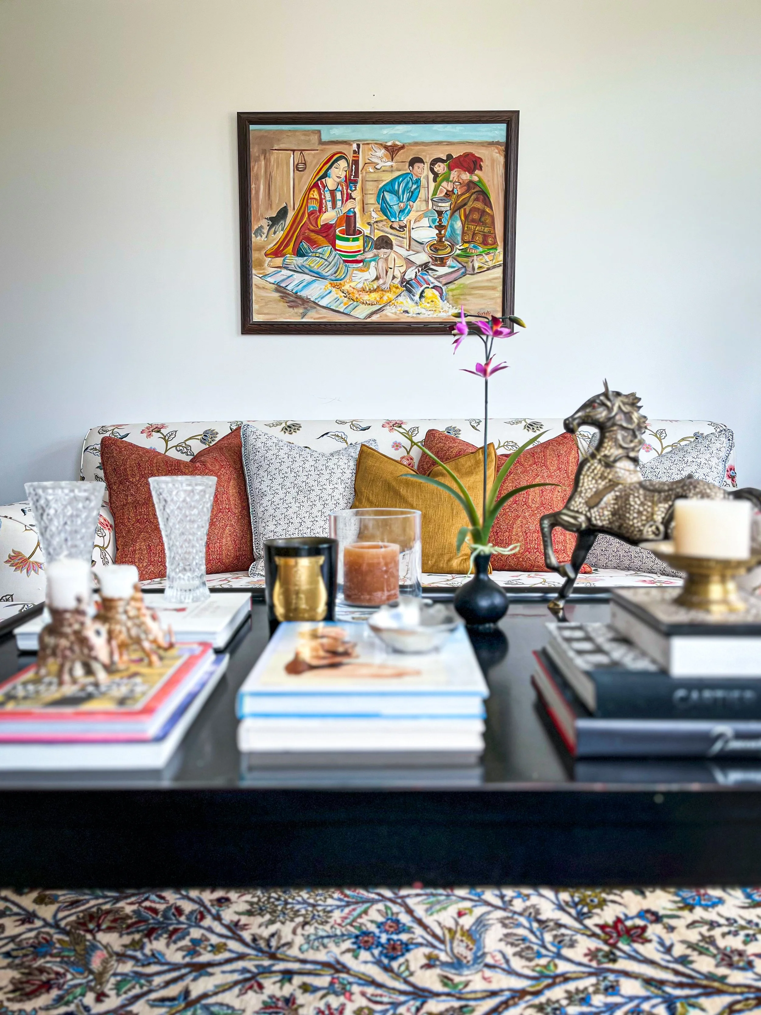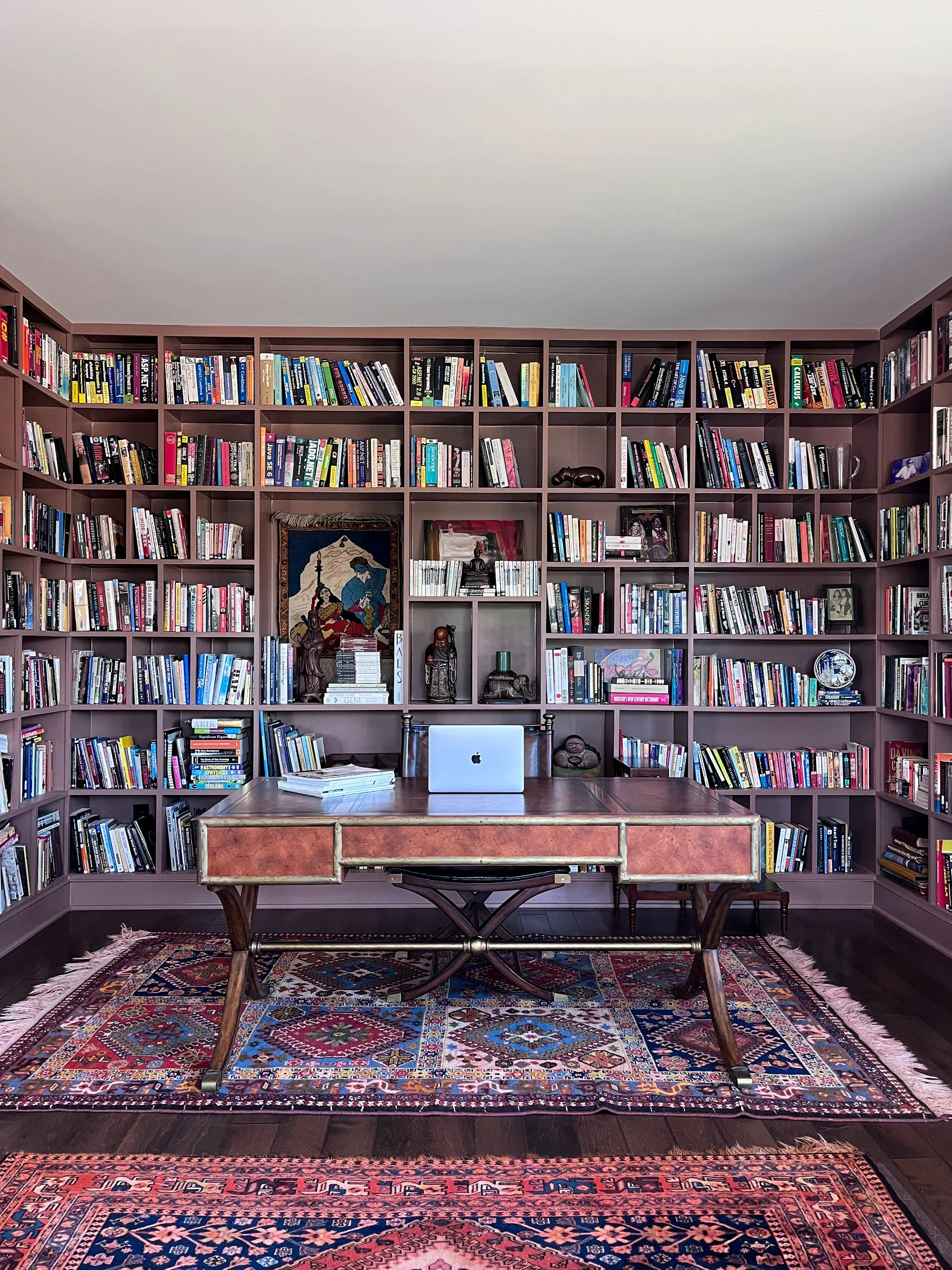 My parent’s requested a warm and layered formal living room that was an inviting spot for entertaining friends. They wanted to celebrate their South Asian heritage by showcasing their collection of artisanal crafts, Persian rugs and paintings created by my mother. As avid readers, they also wanted a bright library with a handsome desk for work and a comfy couch for curling up with a book.