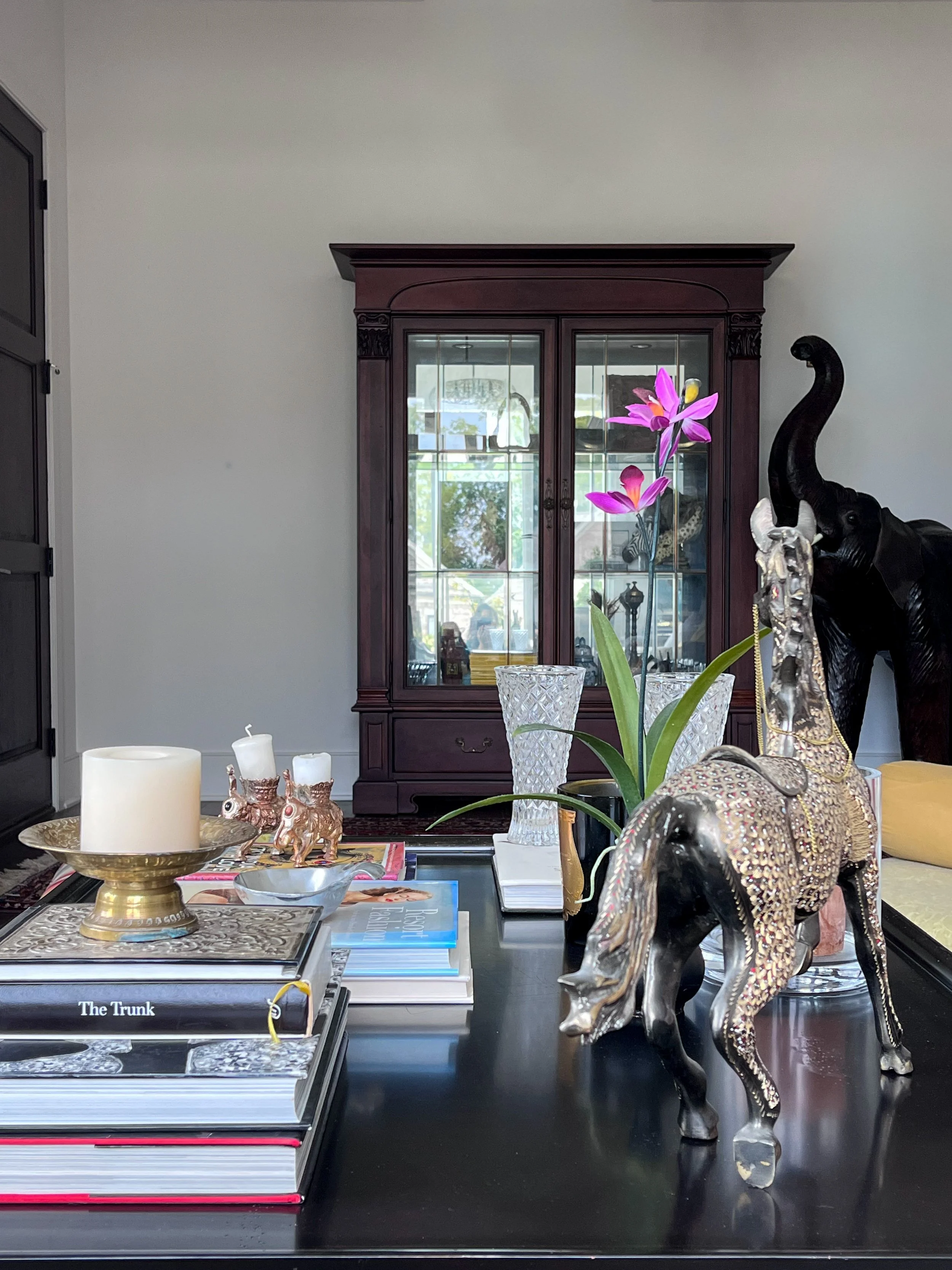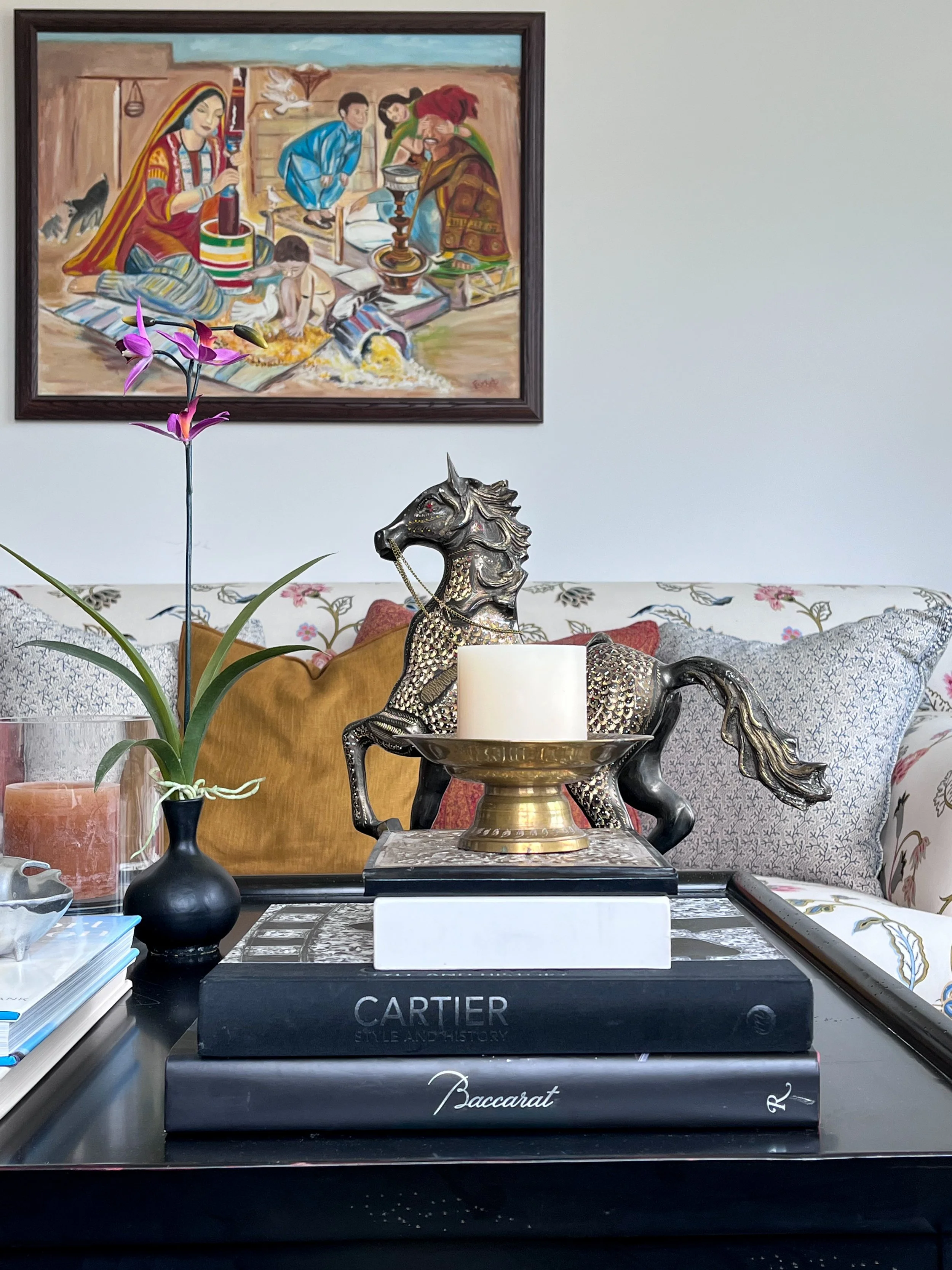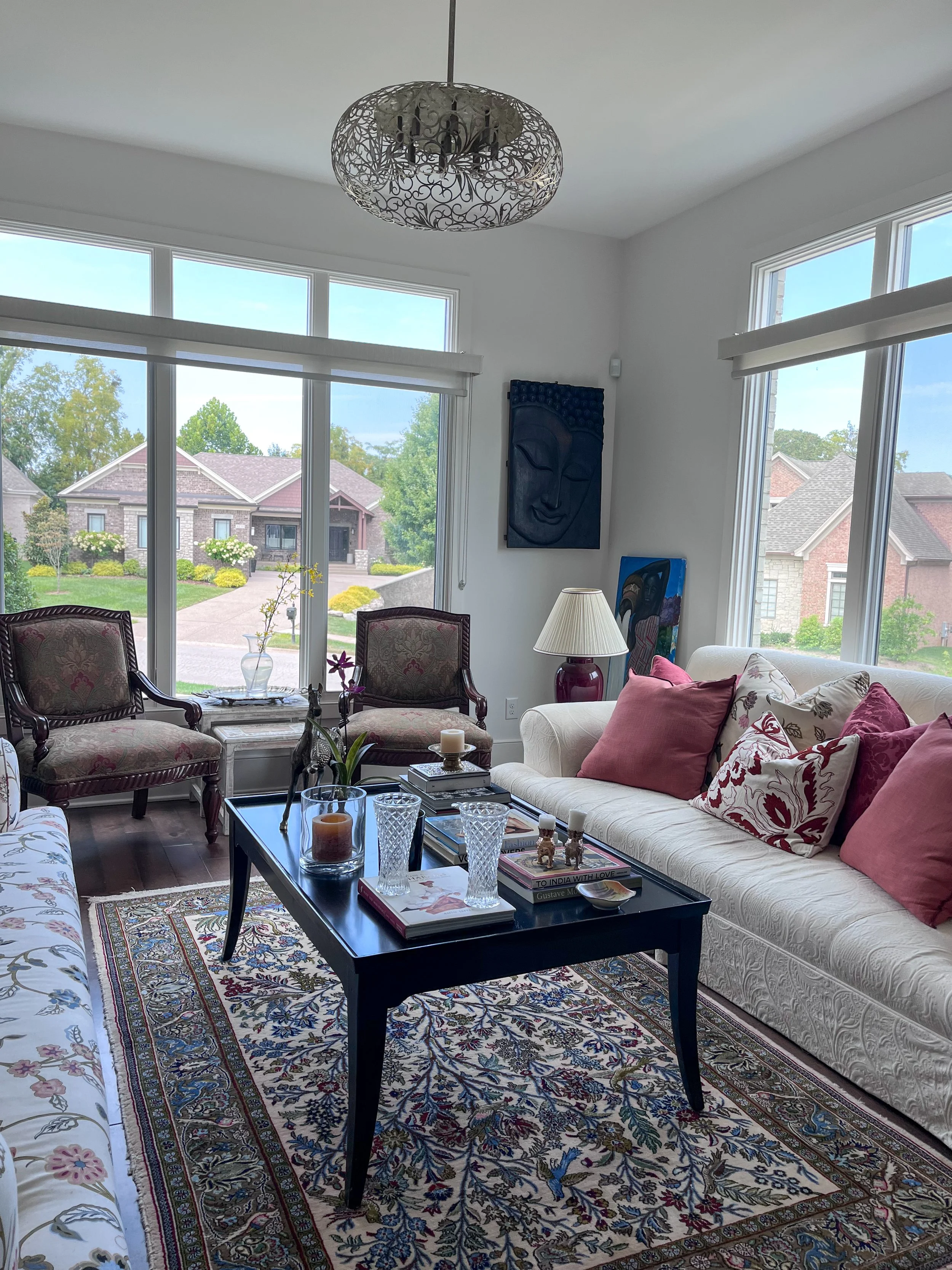 My parent’s requested a warm and layered formal living room that was an inviting spot for entertaining friends. They wanted to celebrate their South Asian heritage by showcasing their collection of artisanal crafts, Persian rugs and paintings created by my mother. As avid readers, they also wanted a bright library with a handsome desk for work and a comfy couch for curling up with a book.
